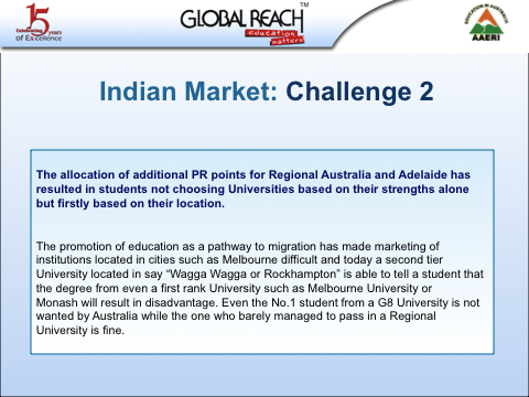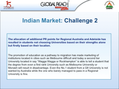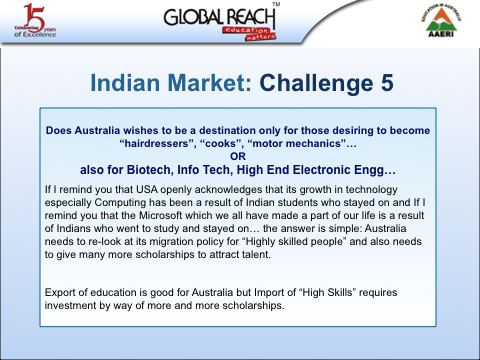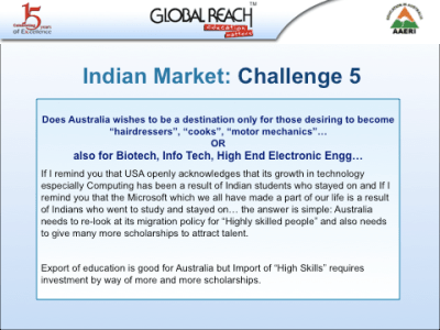 3. I agree…commercialization of Education has ignored the Brand value of an Australian Graduate. In addition, AEI is now going be merged with Austrade without logical justification…