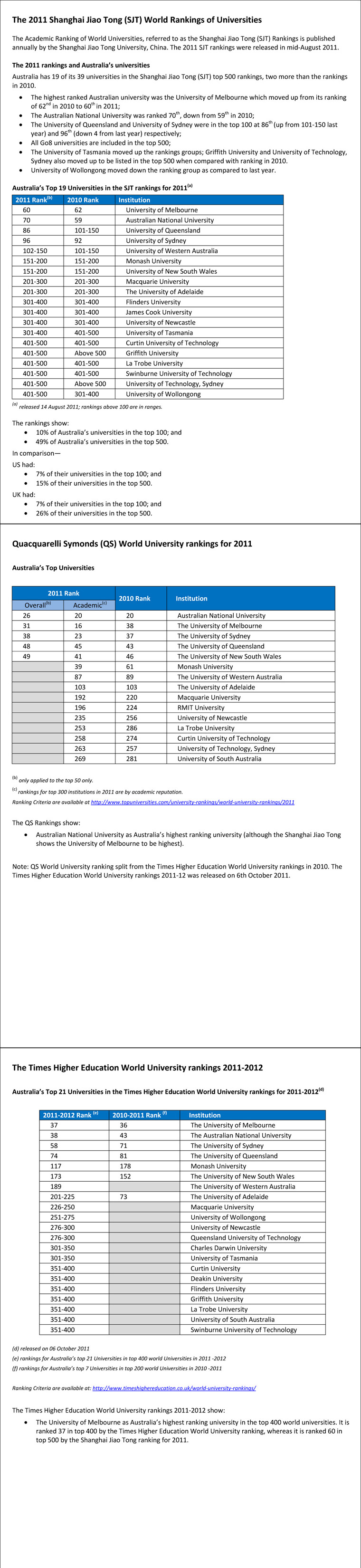 My last blog indicated that 60% of the Aussie Universities are in top-400 in the world as per the Times (THES) 2011 rankings… Now am presenting the analysis by the other two world rankings…