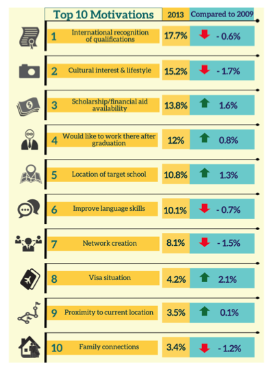 QS released the Analysis of Student Mobility 2013 report and lists “Would like to work there after graduation” as No. 4 factor which 12% of their respondent listed. The other linked motivator “ Would like to work globally after graduation” is not even listed amongst the options for the student and this is only one of the failings of such a survey. The report that has gained publicity across the world simply because of the QS branding and good packaging does more harm than good. A closer look at the methodology of the survey indicates that the targeted respondents are also already quite selective and further no effort has been made to differentiate between the motivations for students in different parts of the world. There are umpteen studies now that give us a clearer perspective that motivation for Indian students differ from motivation for Chinese student and differ from the motivation of an European student seeking study abroad. Such a generalised report doesn’t deserve the attention it has received simply because of such generalisations can cause more harm and hide the real motivations for an International student when seeking education overseas. The QS report can be accessed from the QS website (http://www.topuniversities.com/student-info/qs-guides/trends-International-Student-Mobility-2014).