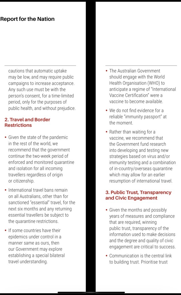 However, now that Australian so-called-ivy-leagues and their researchers have put together a document for the Government as the roadmap for recovery and which is to be considered by the Government later this month, this will be seen as the advise of the University sector. The recommendations include guidance on how to go about with international travel restrictions. The report is downloadable on this link and the relevant screenshot is being shared here.