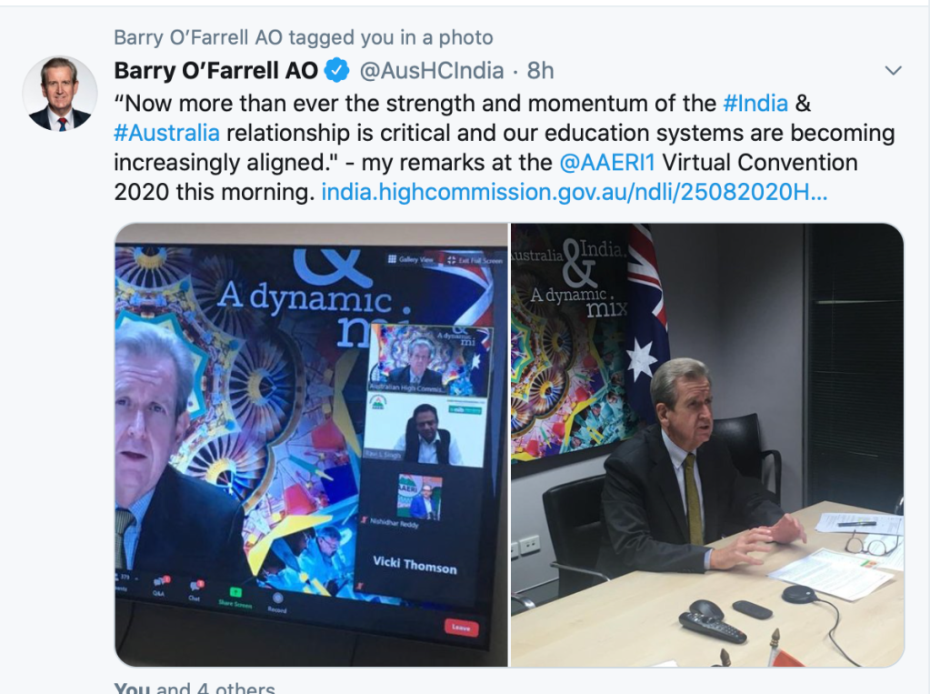 AAERI Convention 2020 kicked off today and it was wonderful hearing the High Commissioner Barry O’Farrell make the keynote address. Most diplomats rarely speak with this clarity. His address (hopefully we will have a recording) dispels at this time that students from South Asia have chance of being included in the currently planned pilots to bring back stranded International students to Australia. There are 6000 such in India alone but since the bilateral travel agreements are yet to be concluded, the students will need to wait on. Most diplomats hold out dreams but Barry was being more realistic. Possibly a bit more than even me. In a reply to a pointed question by me, in view of the uncertainties around, he mentioned clearly that he is not in a position to even confirm that students will most definitely be able to travel back by first intake of 2021. The optimistic in me wants to believe that it will happen and thus will say that the High Commissioner didn’t reject the possibility that continuing Indian students stranded in India and prospective students will travel by early 2021. The High Commissioner did however detail how Australia and India are working closely to address issues around recognition of qualifications and how the future for the International Education trade remains intact despite uncertainty in the short term.