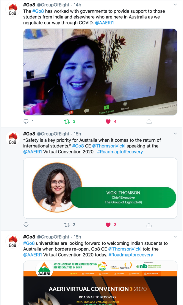 Vicki Thomson is currently the Chief Executive of the Group of Eight Universities. She attended the full session and from her presentation it was clear that she had taken notes from the other presenters. The feedback that we have received indicates that her address was very liked as she championed for the quality of Australian Universities especially for the Australian Ivy League. Pointing out the work being done in reseach including in the vaccine development and being realistic about the immediate term bounce back. She held out that the prospects for the quality Australian providers is intact even though we may have to wait a bit. She also talked of the future of Australia in the Indian sub-continent. In 2016 she was named in The Australian Newspaper’s Top 30 most influential people in Higher Education. In 2018 and again in 2019, the Australian Financial Review named her as the second most powerful person in Australia’s higher education sector after the Federal Minister.