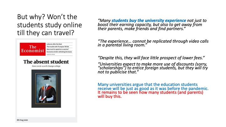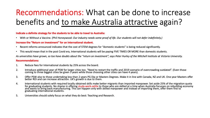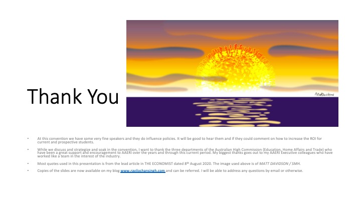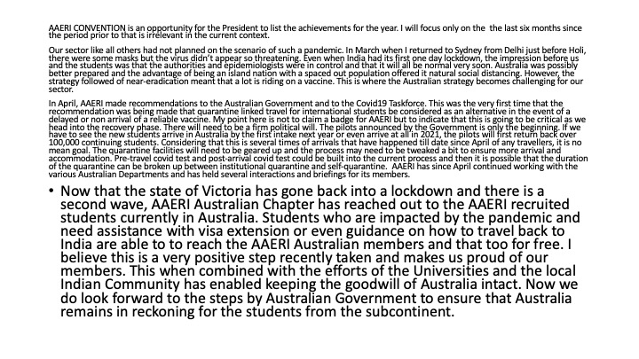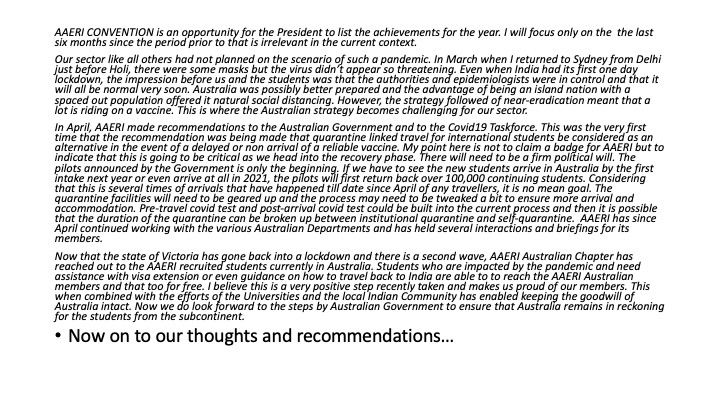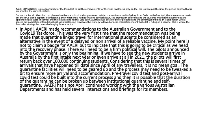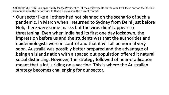 The focus of my presentation as the President of AAERI was that the only way to keep Australia as a destination in reckoning for students from the subcontinent is by ensuring that in the Post Covid scenario, the “Return on Investment” for the student who is investing in Australian qualification is attractive. Attaching here copies of the presentation and hope this helps sets off some discussions.