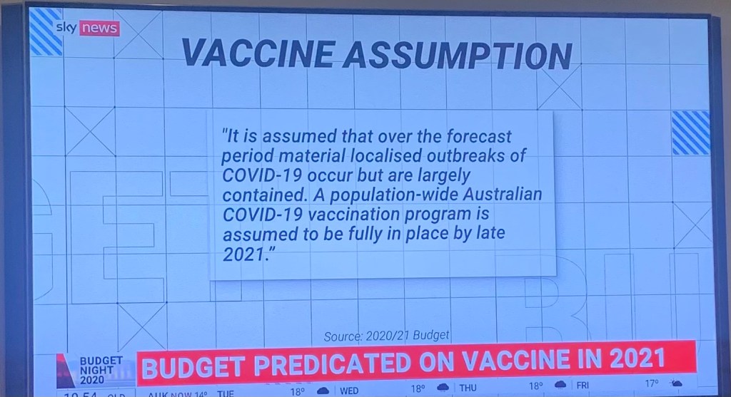 Australian Treasurer Josh Frydenberg tabled the “generous budget” yesterday. I noticed that the underlying coronavirus assumption of the 2020-21 budget is that there would be “population-wide Australian COVID-19 vaccination by late 2021” and that border restrictions and movement bans would be “progressively lifted”.